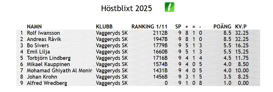 Årets höstblixt bjöd på tufft motstånd – särskilt i toppen, där Rolf Iwansson och Andreas Råvik vann alla sina partier, förutom det inbördes mötet som slutade remi.